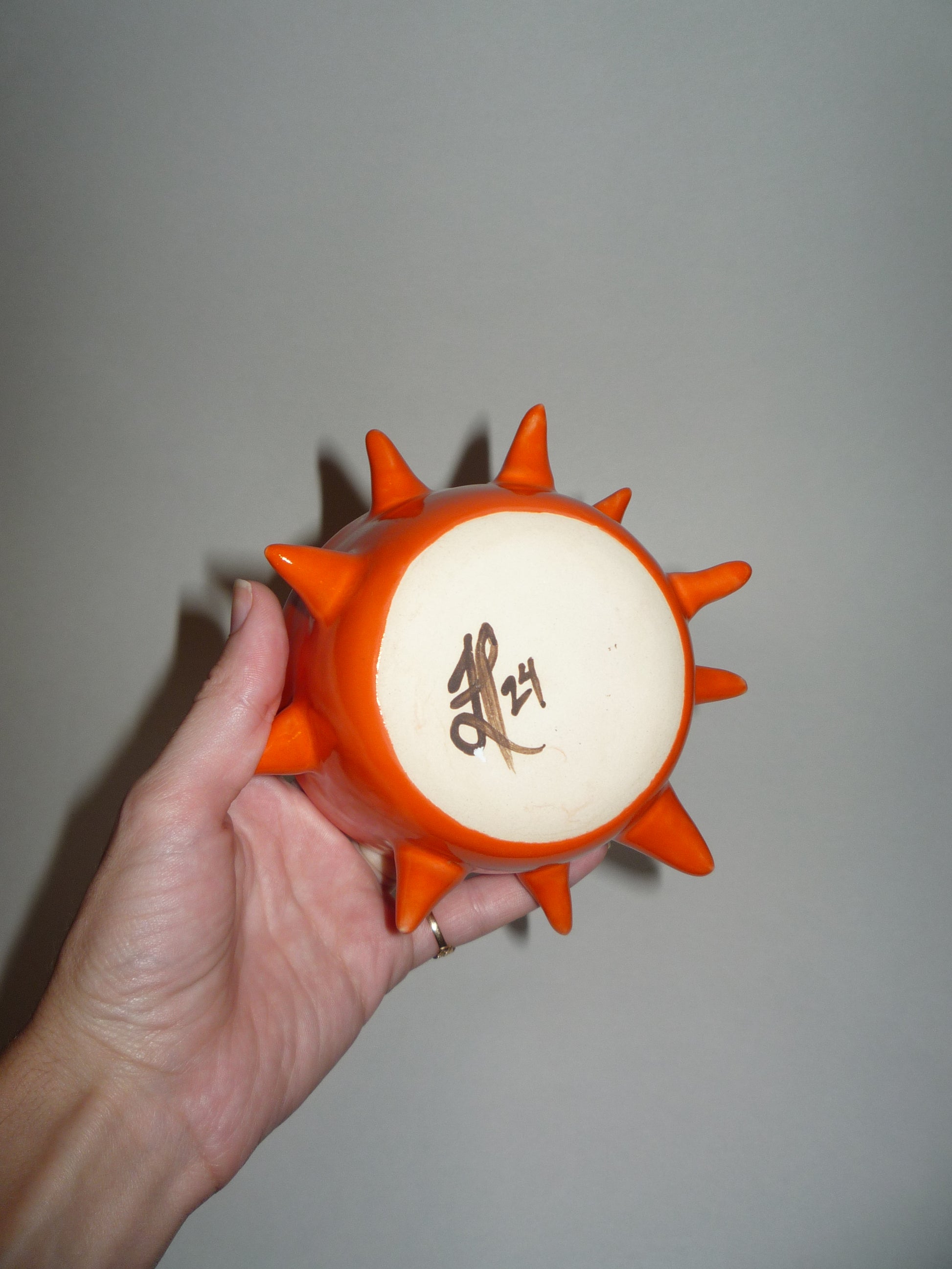 Stoneware; finished with an orange glaze.